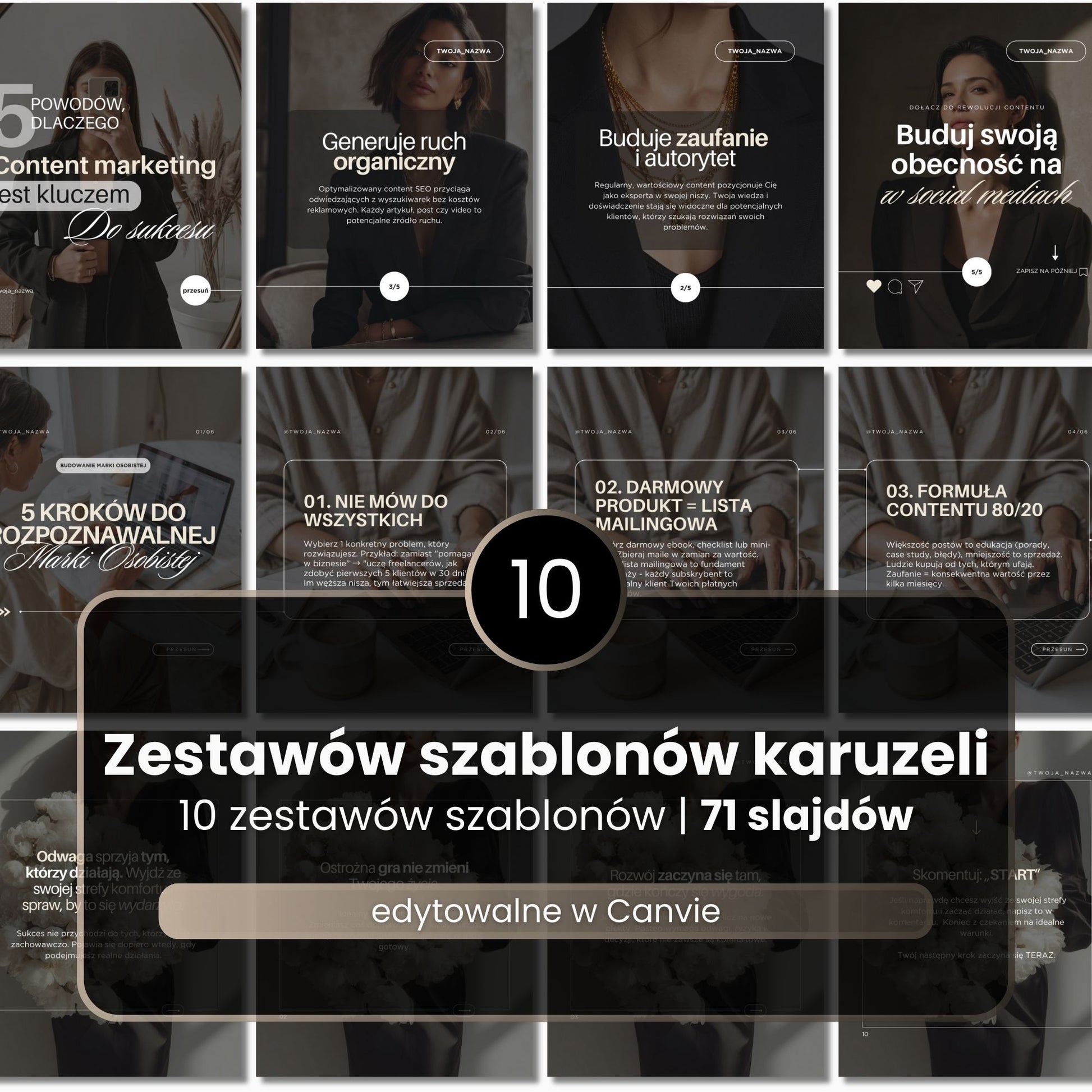 Otrzymujesz 10 kompletnych karuzeli zaprojektowanych w nowoczesnej, spójnej estetyce.