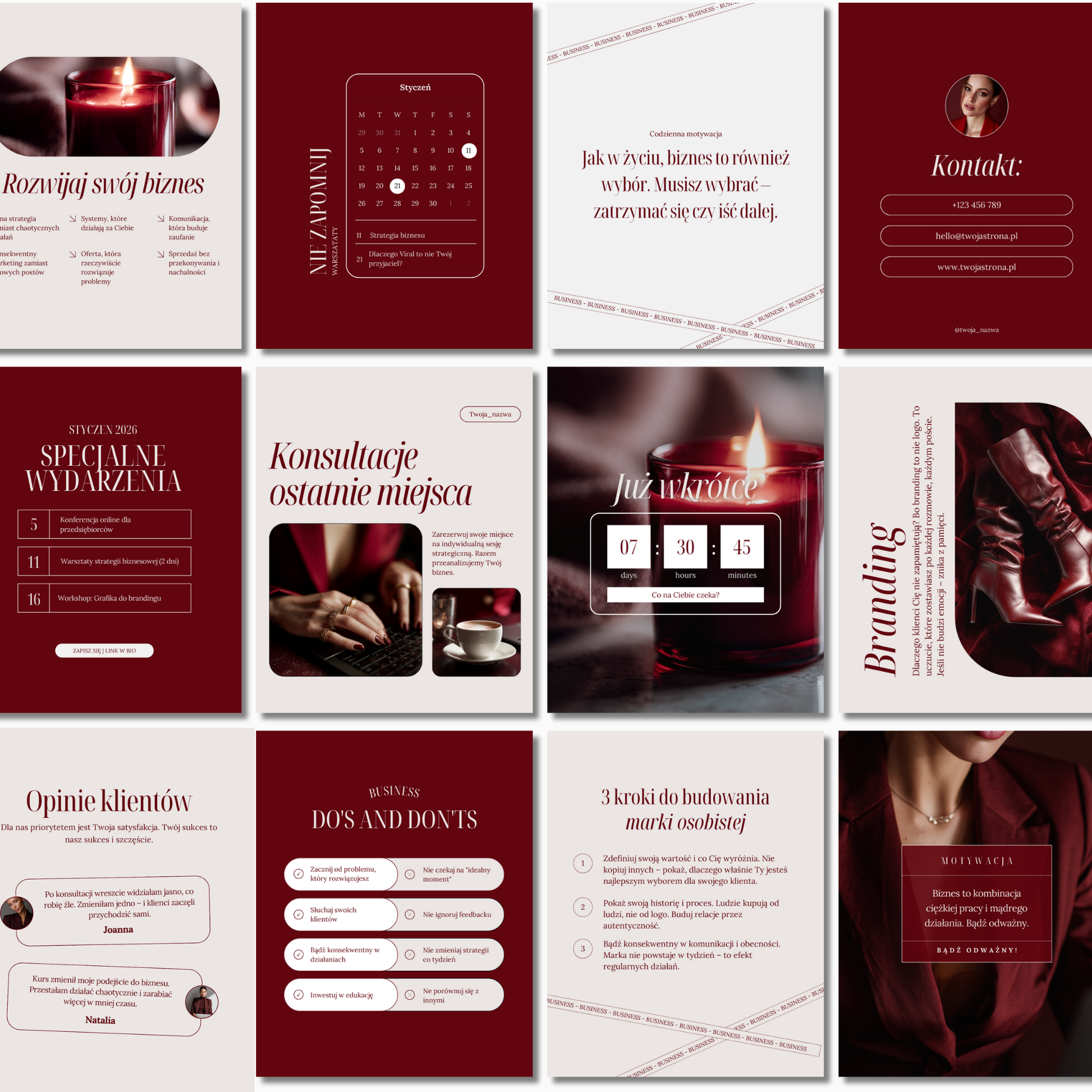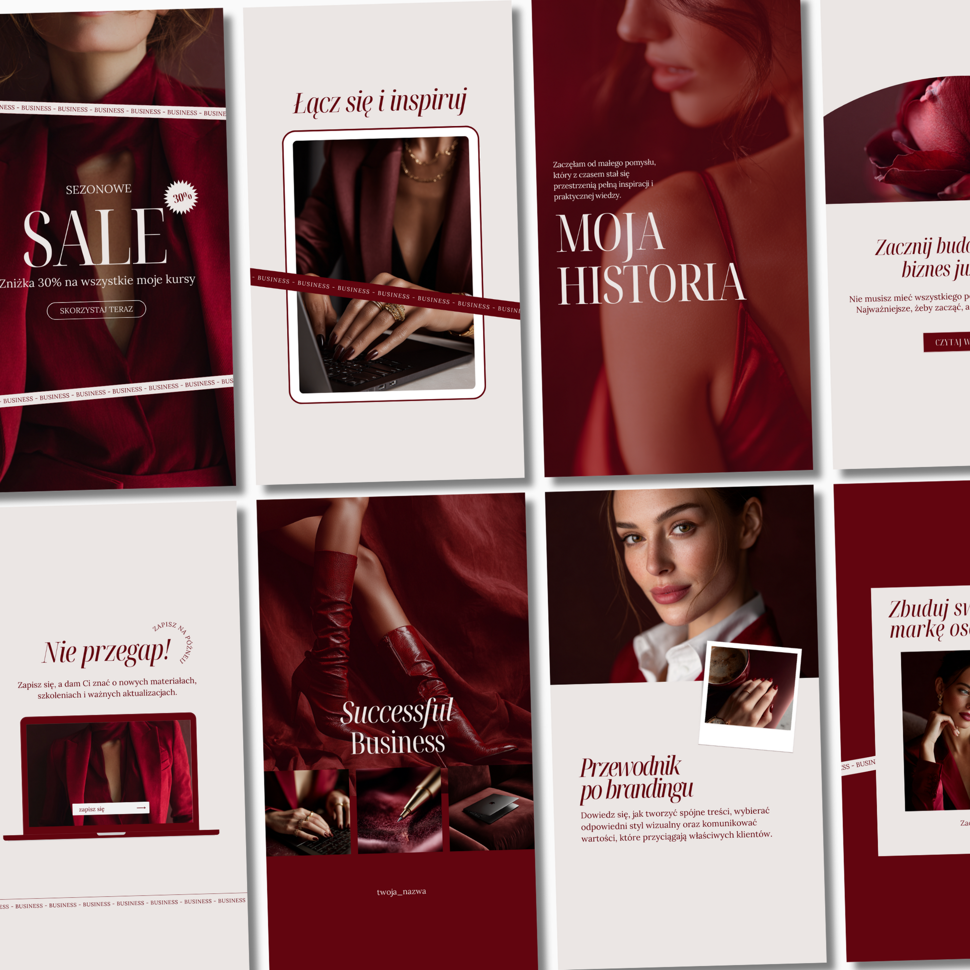 W pakiecie znajdziesz 100 szablonów postów (1080×1350) oraz 100 szablonów stories/reels (1080×1920)