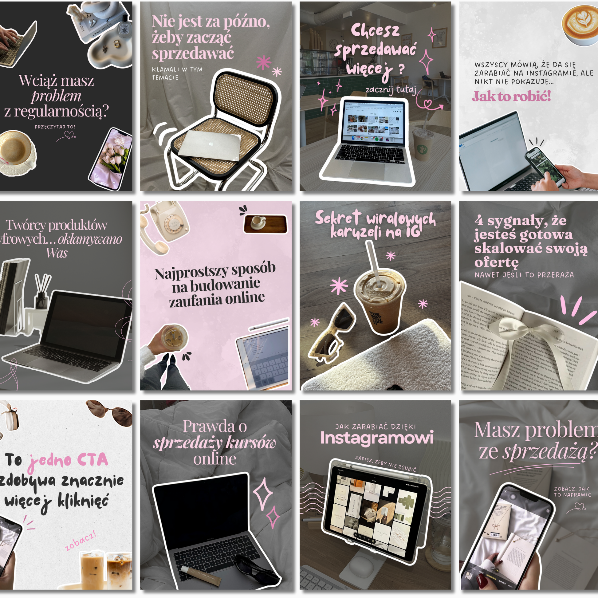 Zestaw edytowalnych szablonów w Canvie do tworzenia postów. Nowoczesny design, spójna identyfikacja i układy, które przyciągają uwagę. Idealne dla twórców, którzy chcą wyróżnić się estetyką i projektować szybko, skutecznie i bez stresu.
